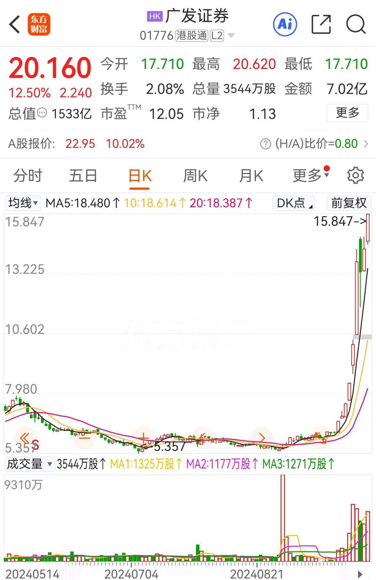 第二步,A股放假,H股券商爆拉,其实H股爆拉需要的资金不多。