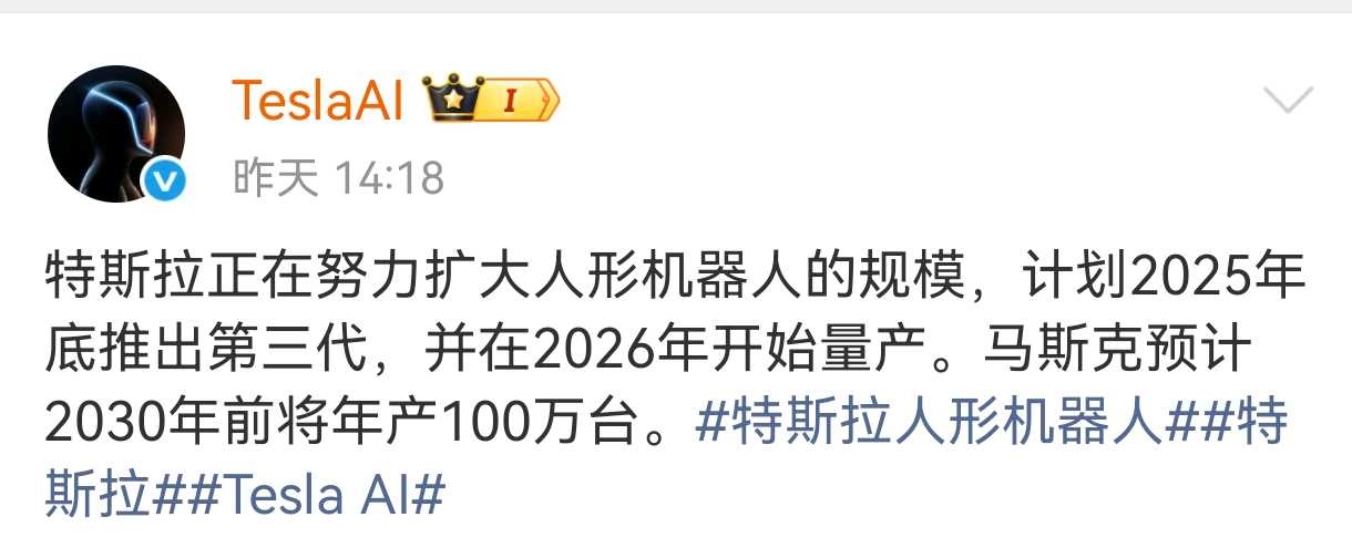 昨天,该账号发文:特斯拉正努力扩大人形机器人的规模,计划年底推出第三代,并在2026年开始量产。