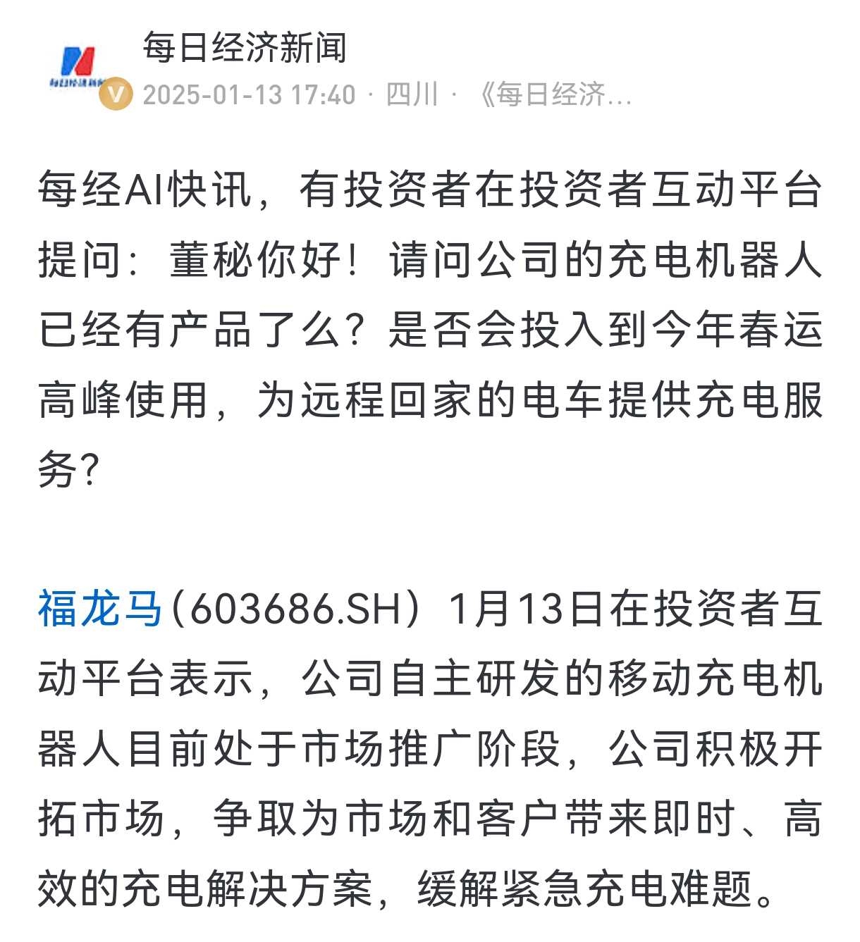 福龙马早在1月份就回复,移动充电机器人就开始市场推广了。