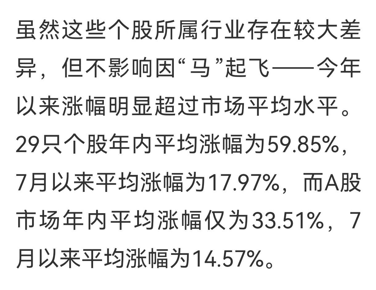 文中列举的马字头的涨幅,全年涨幅60%,全A涨幅34%。7月以来涨幅34%,全A涨幅15%。