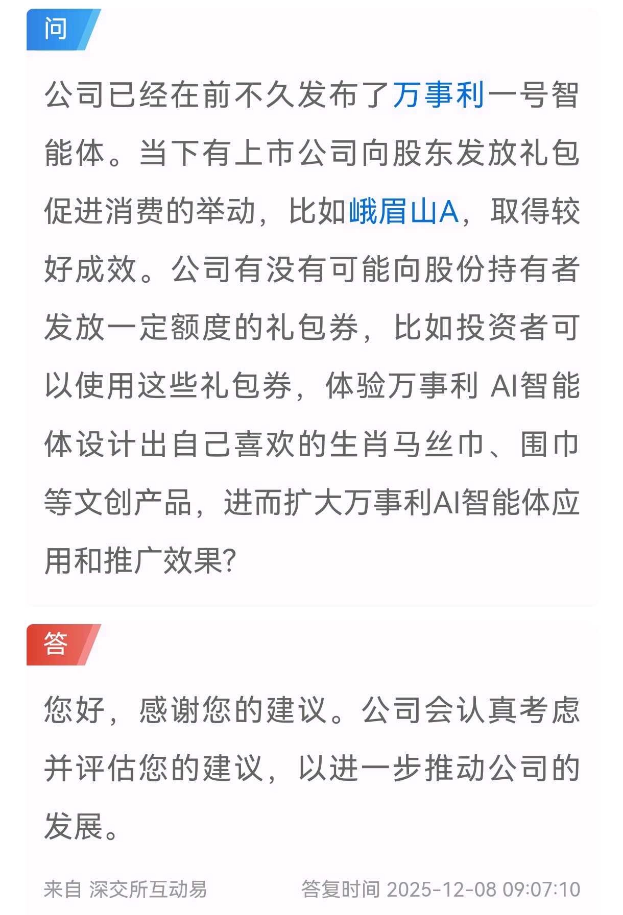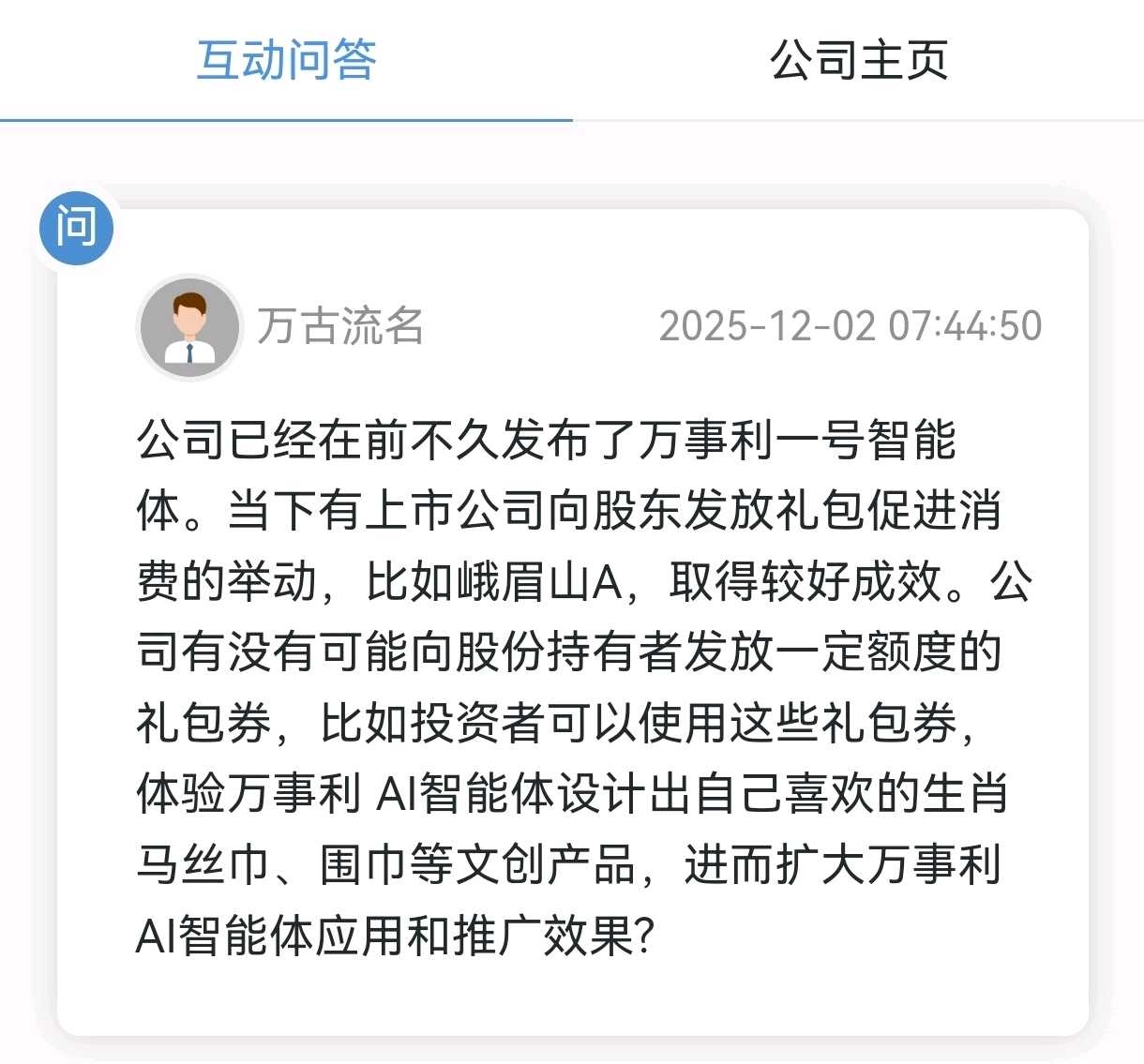 万事利,我于12月2日早上向董秘提出问题,关切公司AI智能体推广和股东礼品包事宜。