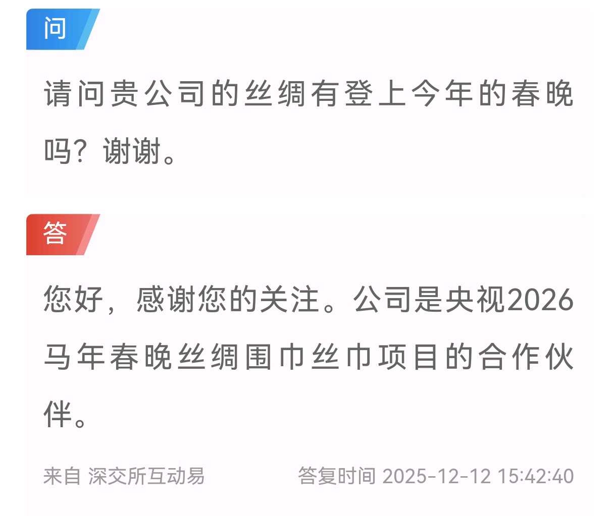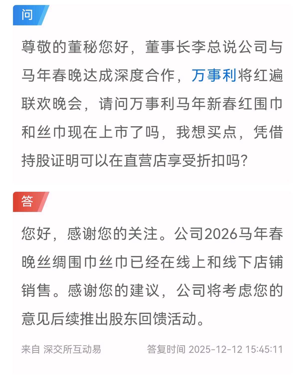 一是,万事利实锤马年春晚合作,并且马年春晚联名产品已经在线上和线下销售。这是最实质的生肖马概念股,品牌宣传和推广的实质行动,并非单独凭名字、炒名字。