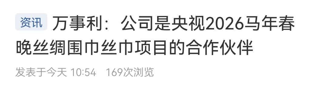 万事利马年春晚合作长期受益,去年宇树机器人上春晚,效果明显。