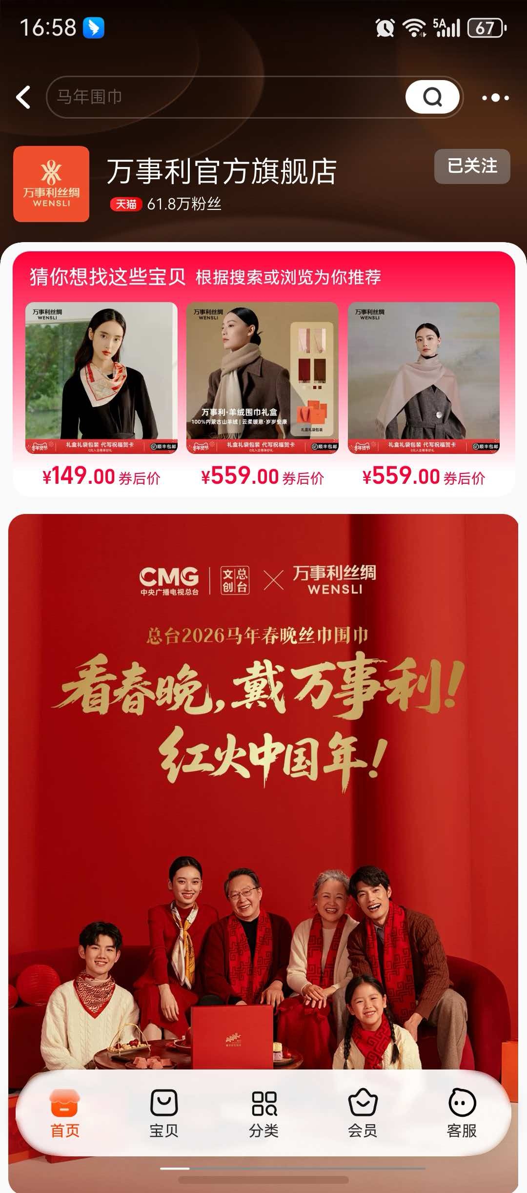 以淘宝万事利官方旗舰店为例,昨天下午16:58的粉丝数量是61.8万人,现在是62万人,增加2000人。