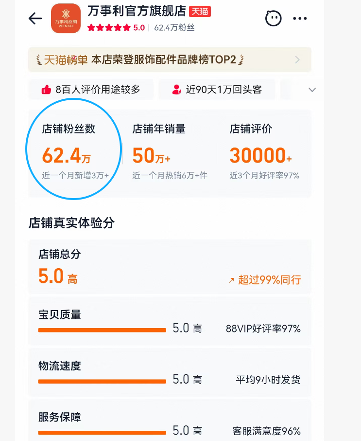万事利有线上、线上等多种渠道和平台销售,以天猫万事利官方旗舰店为例,该店已经开了15年,积累的粉丝数量是60万。
