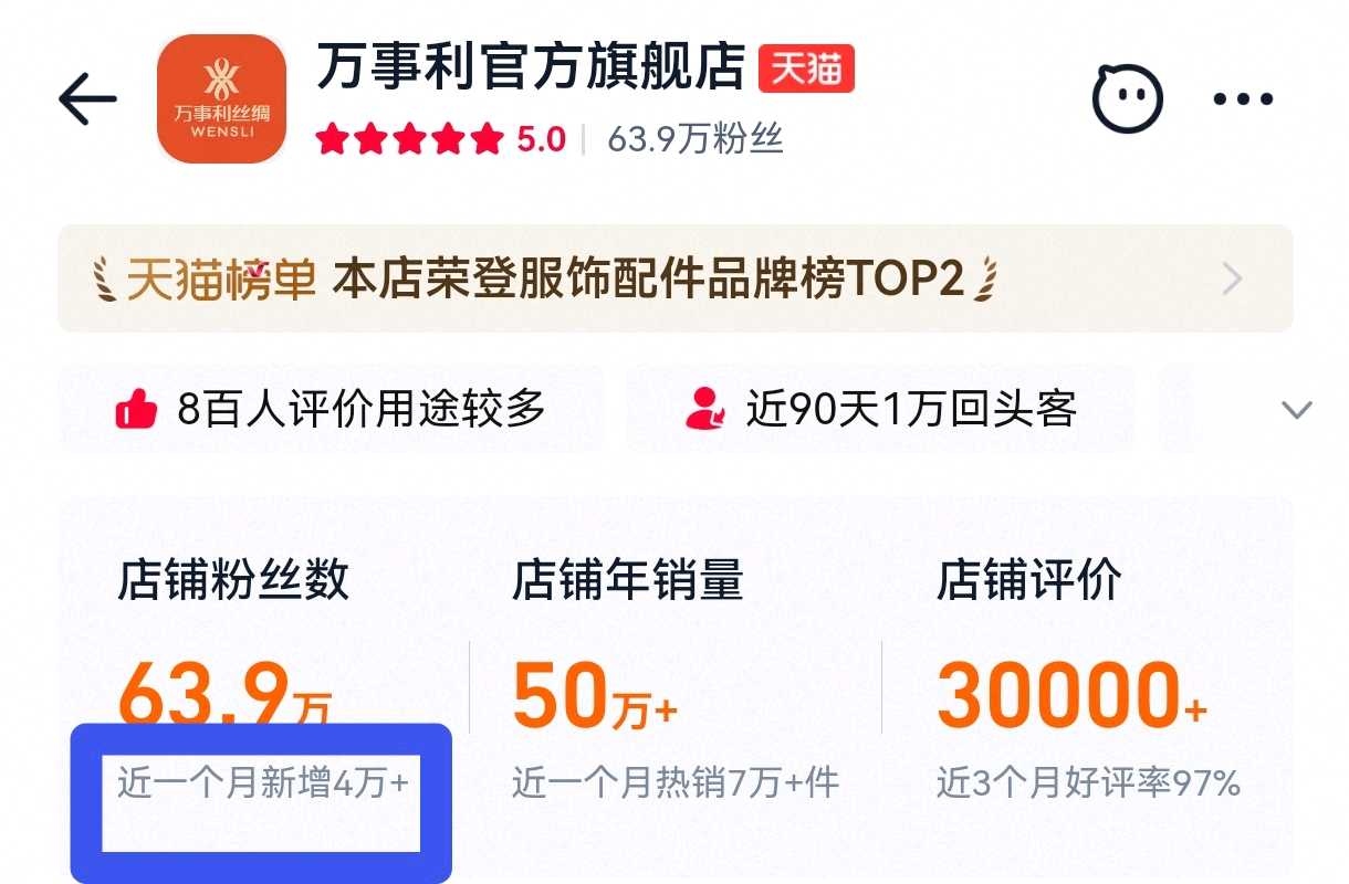以万事利天猫官方旗舰店为例,粉丝量月新增4万+,还在加速增长。