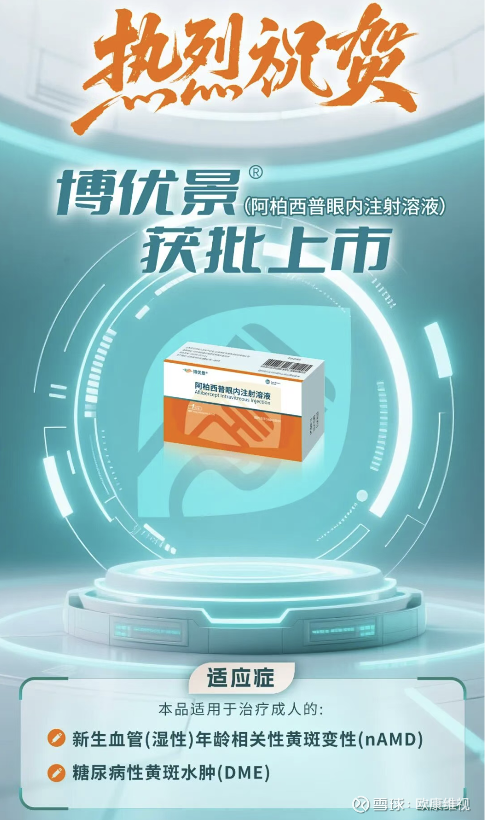 $欧康维视生物-B(01477)$ #欧康维视生物# #眼科# #港股# 北京时间2025年11月26日,欧康维视宣布抗VEGF药物OT-702(博优景®,阿柏西普眼内注射溶液)正式获得中国国家药品监督管理局的上市批准,用于治疗成人的新生血管(湿性)年龄相关性黄斑变性(nAMD)和糖尿病性黄斑水肿(DME)。