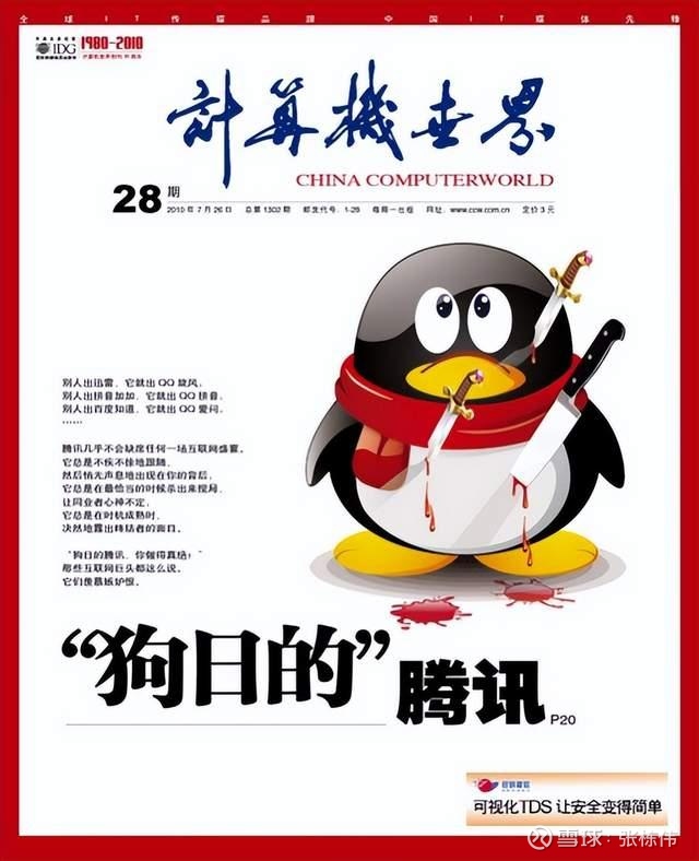 2010年7月24日,当时中国最权威的IT媒体《计算机世界报》,以封面报道发表了一篇重磅文章——《“狗日的”腾讯》,刷遍了各大网站和论坛。