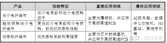 相较于普通电子布,特种纤维布主要应用于高频高速PCB并最终应用于AI服务器、数据中心交换机相领域,其性能特征和应用领域具体如下:
