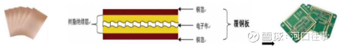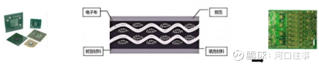 2)低膨胀纤维布:芯片封装内部布线密度极高,在芯片封装和焊接后的回流焊过程中,封装基板/PCB会经历高温,需要用电子布加工成的载板与芯片的热膨胀系数(CTE)匹配,以承受温度变化时产生巨大的热应力,避免焊接点开裂、基板翘曲相缺陷。同时,由于终端应用设备功率通常大,发热严重,工作环境温度变化剧烈,低膨胀性可以确保PCB在严苛的温度循环下保持尺寸稳定,避免线路断裂和分层,从而提升可靠性。因此,低膨胀纤维布主要应用于芯片封装基板,在芯片封装完成后,再随芯片组装到高频高速PCB上。芯片封装基板主要的结构及应用如下图所示: