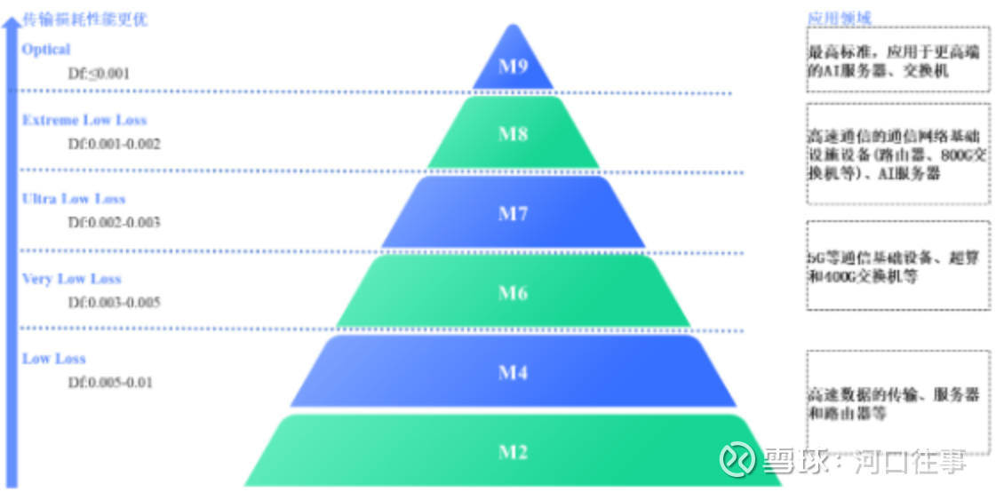 、下游客户对产品性能要求松下电工Megtron系问为高速覆铜板领域分级标杆,其对于高速覆铜板相级分类为M2至M9,M9为最高级别。不同损耗级别的覆铜板对应不同的应用领域,具体如下: