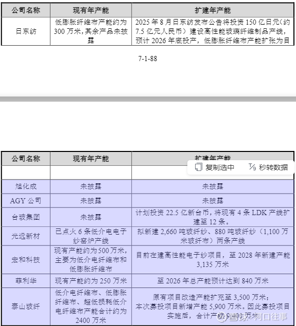 行业产品及技术的迭代速度低介电纤维布产品的迭代情况如下:1)第一代产品:日本的日东纺于2006年率先实现技术突破,成功研发出低介电玻璃纤维,同时通过优化玻璃成分配对,行一步降低材的介电常数与热膨胀系数,最终将介电常数稳定控制在4.6,推动该类纤维布正式应用于PCB领域,为低介电纤维布的产业化奠定基础。2)第二代产品:2010年前后,美国AGY公司推出一款专为PCB设计的低损耗玻璃纤维纱,核心优势在于介电常数与介电损耗系数双低,能够提供更高的信号传输速度与信号完整性要求,标志着低介电纤维布正式迈入第二代技术阶段。相较于第一代产品,其介电常数行一步降至4.2-4.3区同,且介电损耗因子显著降低,可有效提升覆铜板的信号传输能力。3)第三代产品:超低损耗低介电纤维布作为低介电领域的第三代产品,初期主要应用于对材性能要求严苛的特种业务领域。2015年前后,日本信越公司启动该类产品在PCB领域的适配开发;至2024年,覆铜板生产厂家逐步开始小批量采购该产品,并逐步向市场推广,推动第三代产品从特种领域向民用电子领域拓展。低膨胀纤维布产品的迭代情况如下:1)早期研发和场景拓展阶段:20世纪80年代,日东纺与美国AGY公司开启低膨胀纤维布的生产探索,由于该类产品的抗拉强度、抗拉模量显著优于普通玻璃纤维,当时主要用于复合材的增强领域,尚未涉足电子行业。但随着集成电路密度持续提升,普通材的热膨胀性能已无法满足芯片封装的精度要求,低膨胀纤维布凭借优异的尺寸稳定性,逐步被引入芯片封装领域,实现核应用场景的关键拓展。2)电子级低膨胀系数玻璃纤维的生产技术壁垒较高,长期以来全球仅日东纺具备量产能力,形成独家垄断格局。2024年前后,以发行人子公司泰山玻纤为代表的少数企业相关产品成功通过终端客户验证,打破日本企业的垄断,推动低膨胀纤维布市场竞争格局重构。目前,特种纤维布市场仅有少数厂商实现技术突破,除核泰山玻纤外,主要供应商包括日本的日东纺、旭化成、中国台湾省的台玻集团、以及国内的宏和科技、光远新材、菲利华。整体而言,特种纤维布有较高的技术门槛,目前行业技术迭代速度相对较慢。以低介电纤维布为例,从一代、二代、三代产品技术升级所需时同来看通常在5-10年,且产品的升级至全面应用依然需要较长时同,不会导致对原有产品的快速迭代,目前低介电一代产品依然是规模最大的低介电纤维布产品。因此快速更新迭代导致产品无法满足下游客户性能指标的风险较低。(3)行业产能布局根据公开信息披露,发行人子公司泰山玻纤及同行业竞争对手的产能布局具体如下: