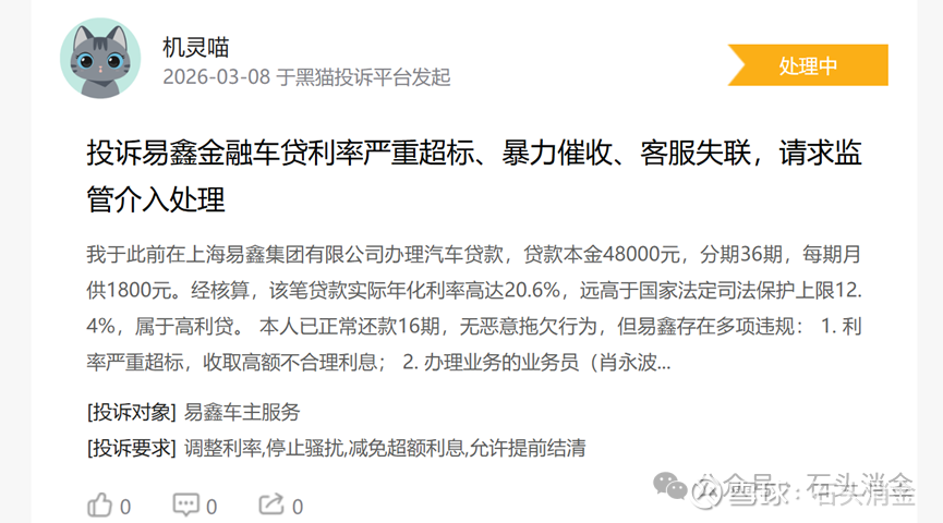 除财务数据外,易鑫的业务合规性也屡遭质疑。根据黑猫投诉平台信息,易鑫车贷业务存在多项争议: