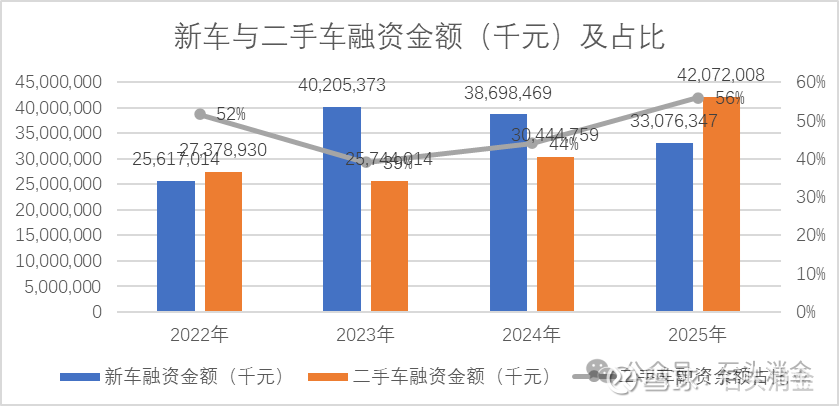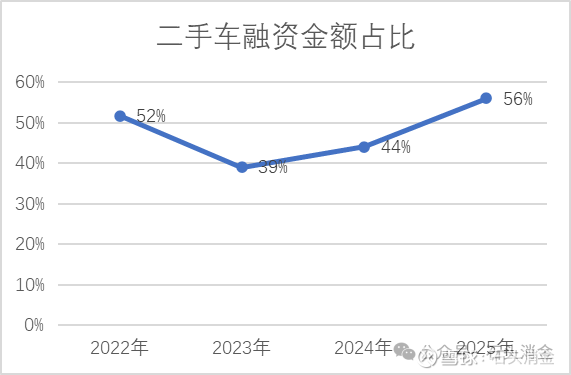 然而,2024年及2025年的实际业务并未沿此路径发展。新车融资交易数量从2023年的39.9万辆降至2024年的37.6万辆,2025年进一步下滑至30.7万笔,同比下降19%;新车融资金额也从387亿元降至331亿元,同比减少15%。相反,二手车融资业务持续扩张,交易量由27.9万辆增至35万辆,2025年达53.7万辆。这一趋势与2023年报中的风险收缩战略明显背离。