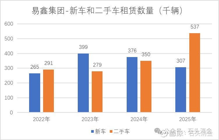 从融资租赁业务构成看,易鑫集团在二手车与新车之间频繁切换。2022年二手车融资占比为52%,2023年降至39%,但2025年又回升至56%,显示出战略方向缺乏连贯性。