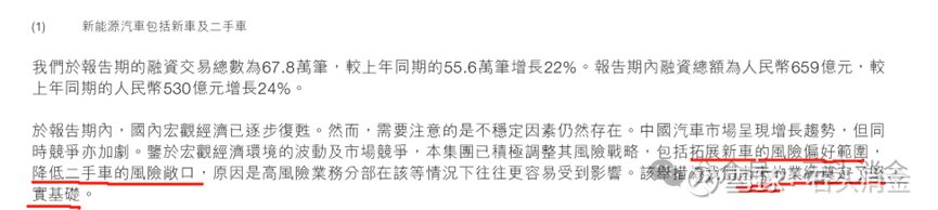 值得注意的是,2023年财报管理层曾表示:“鉴于宏观经济环境的波动及市场竞争,本集团积极调整风险战略,包括拓展新车的风险偏好范围,降低二手车的风险敞口,因为高风险业务分部在此情况下更容易受到影响。该举措为我们未来的业绩奠定了坚实基础。”