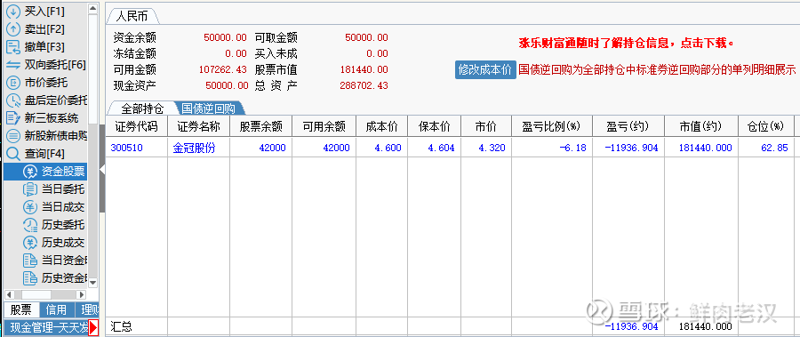1、期末持仓:300510金冠股份4.2万股;总资产:288702.43元