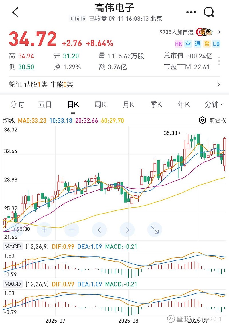 $高伟电子(01415)$什么最难,看不到希望的咬牙坚持!埋伏苹果17,结果越临近发布会钺跳水,甚至发布会当天,来个10米跳台,当时直接想清仓。也许就是侥幸心理,拖延2天,今天市场给了8厘米,暗戳戳自喜。但依然不了解,横在32那么久的原因,求教大佬