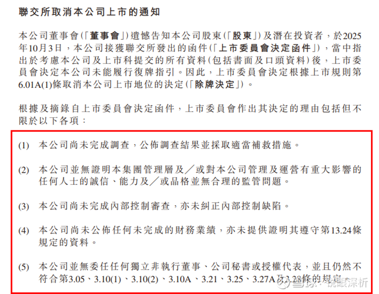 财务核查尚未完成,审计机构的变动让局面更加复杂。毕马威曾建议成立独立调查委员会核查相关异常交易,在调查推进前,其于2024年4月正式辞任审计师职务。此后,洪九果品始终未能披露2023年年报及后续定期报告,信息披露的不连续成为其复牌的主要障碍。根据港交所《上市规则》,若公司未能在停牌后18个月内履行复牌指引并实现复牌,港交所有权将其除牌。尽管洪九果品获得3个月延期,仍未能在2025年9月19日的最后期限前完成复牌,上市委员会于10月3日作出取消其上市地位的决定。后续公司申请复核,但上市复核委员会最终维持原判,彻底关闭了重返资本市场的通道。