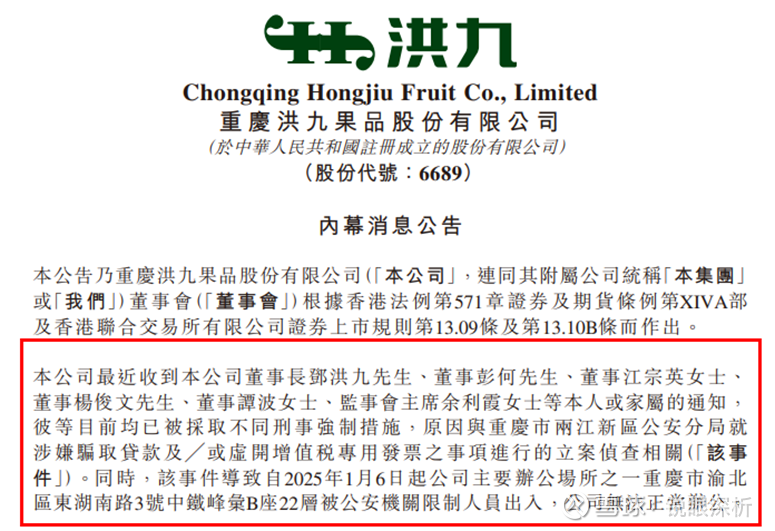 财务层面的问题尚未解决,核心管理团队的动荡进一步加剧了企业困境。2025年4月16日,洪九果品发布公告披露,创始人、董事长邓洪九,董事彭何、江宗英、杨俊文、谭波及监事会主席余利霞等核心管理人员,因涉嫌骗取贷款、虚开增值税专用发票被重庆市两江新区公安分局立案侦查,并被采取不同刑事强制措施。更为关键的是,公司总部大楼自2025年1月起已被限制人员出入,IT基础设施使用受限,正常办公秩序受到影响,业务运营被迫由分公司、附属公司及地区人员分散维持。