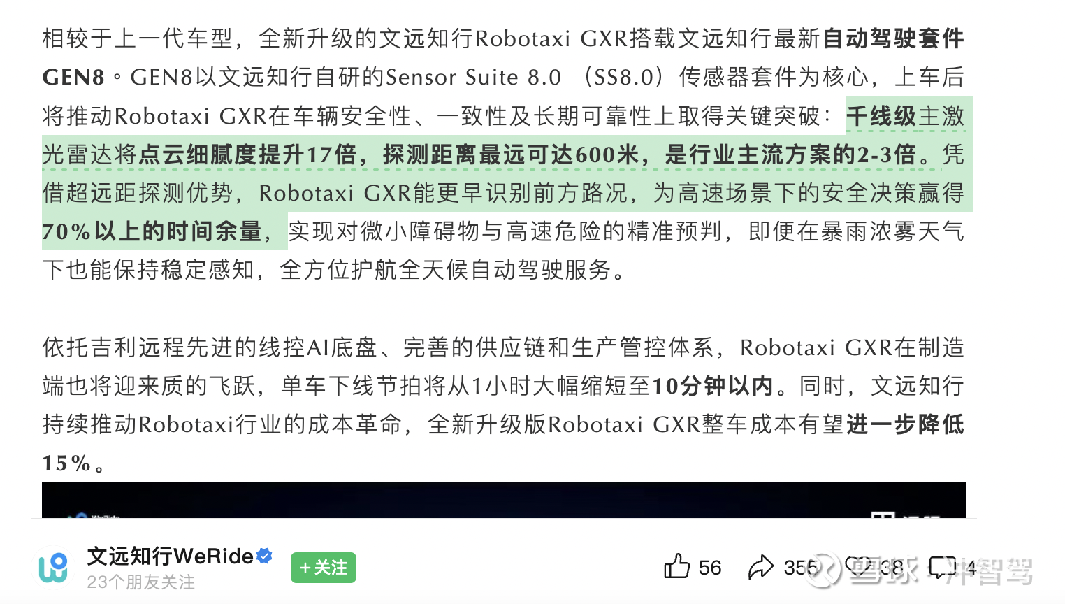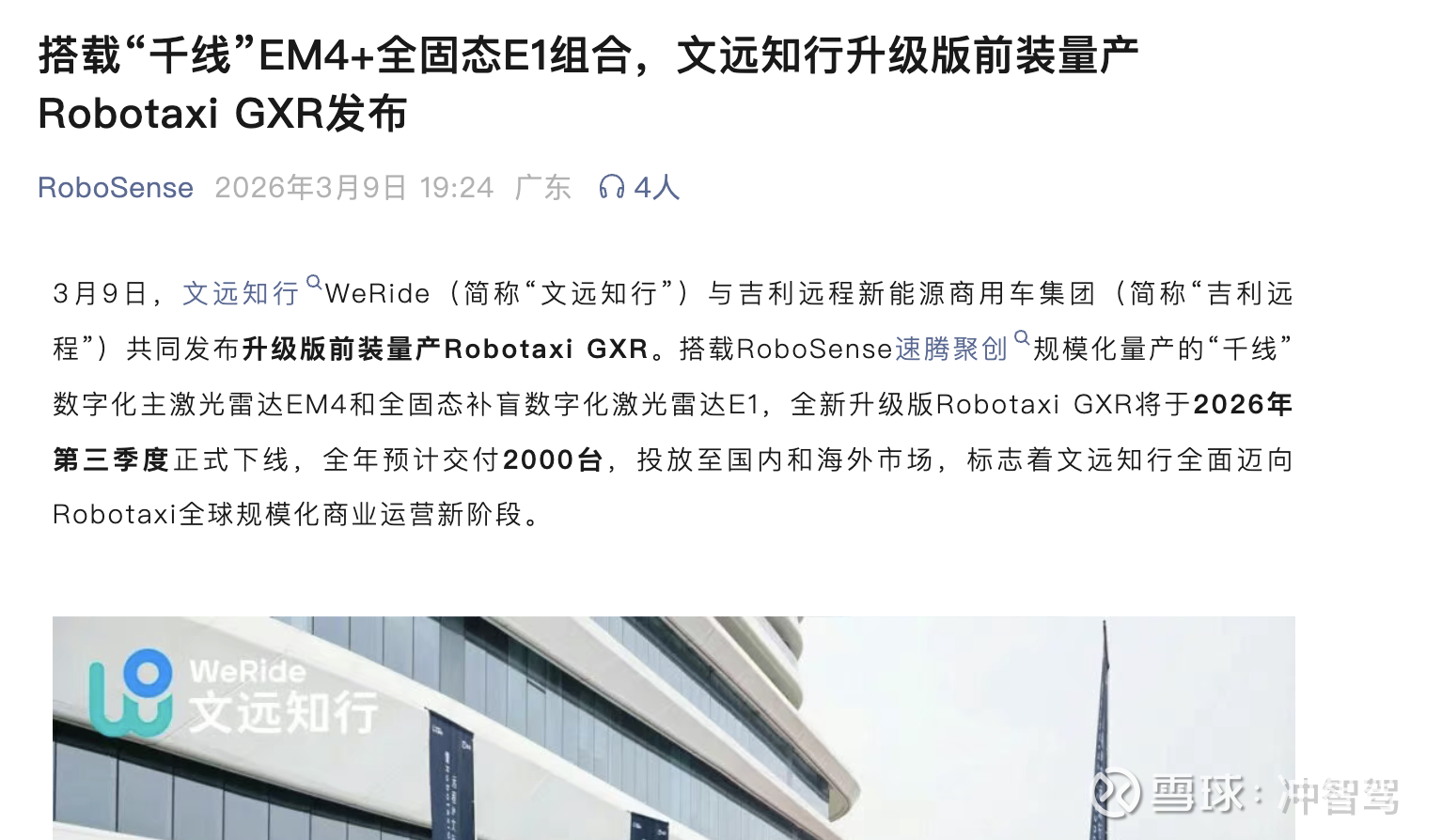 之后,速腾也跟进宣布,升级版GXR正是搭载的千线EM4+全固态补盲E1组合,下线时间、升级细节等口径均与文远知行保持一致。官方媒体也在第一时间证实了这次合作。