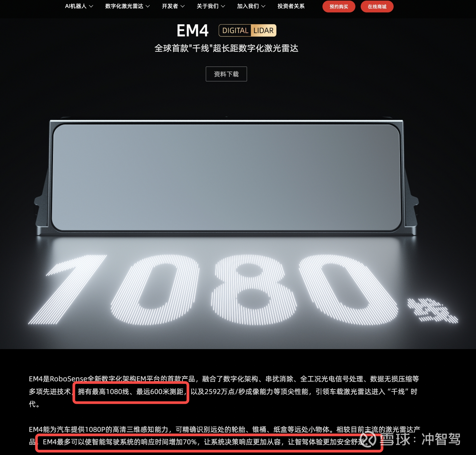 这就有意思了,文远知行官宣时清楚表明,所谓升级版,就是因为搭载了千线级主激光雷达,探测距离最远可达600米,可为安全决策赢得70%以上的时间余量——这与速腾聚创EM4的官网介绍一模一样。