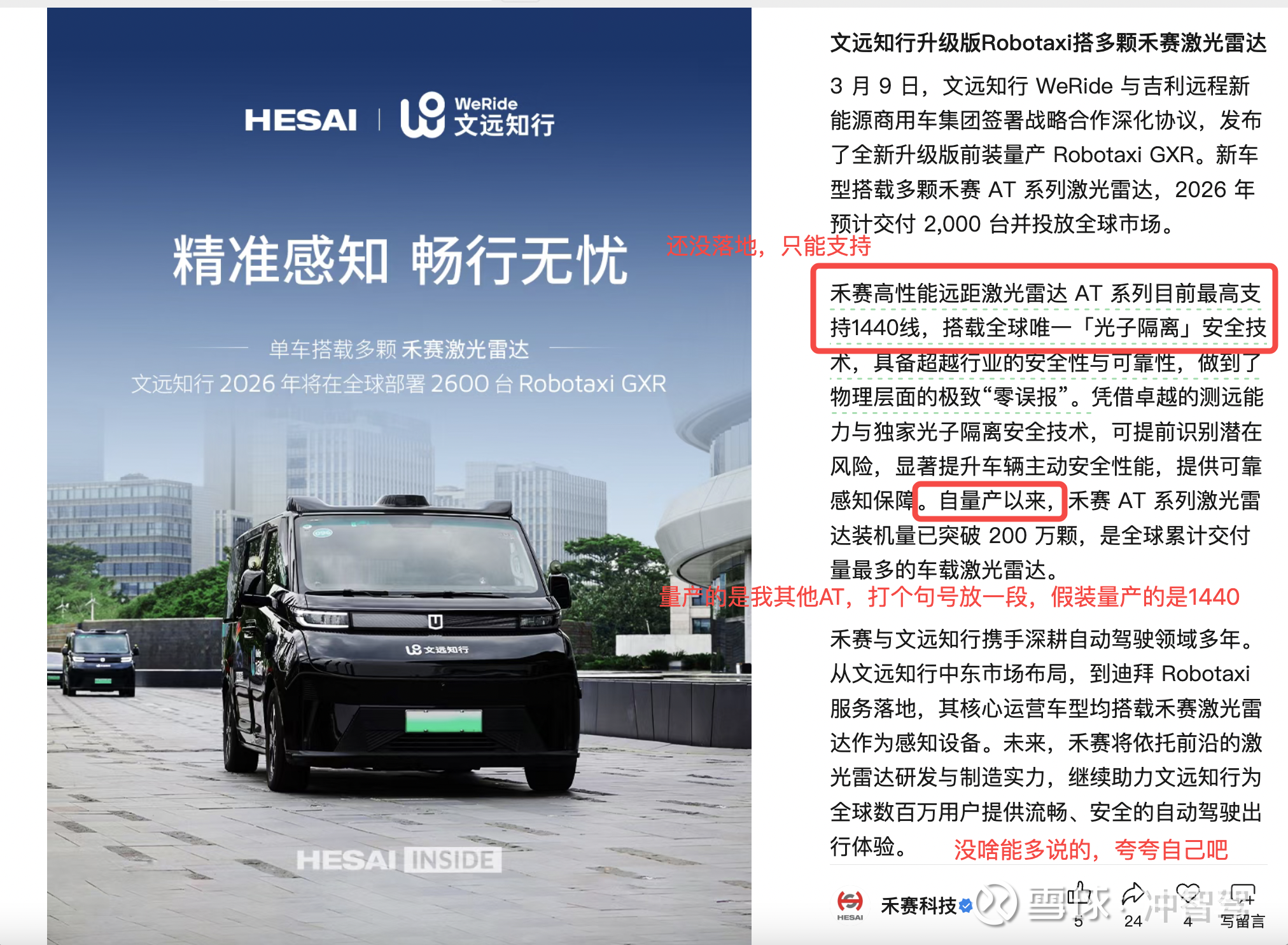 有意思的是,禾赛晚上快10点也冷不丁来了条,说文远搭载他们的激光雷达。