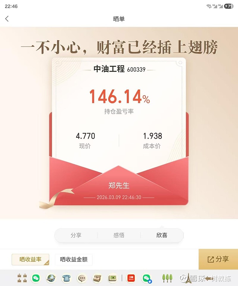 9:20之前,中油工程的报价一直是涨停价5.12元,9:22之后开始有所下降,最终9:25的开盘价是5.00。我观察到其他的石油股要么是涨停要么是大涨,推测中油工程也会涨停。于是我在9:30之前挂了5.10元的卖单,这些股票是上一个交易日4.6元买入的。果然开盘没多久中油工程就涨停了。下午中油工程跌了挺多,但是没有跌到我的心理价位,因此没有做T的机会。