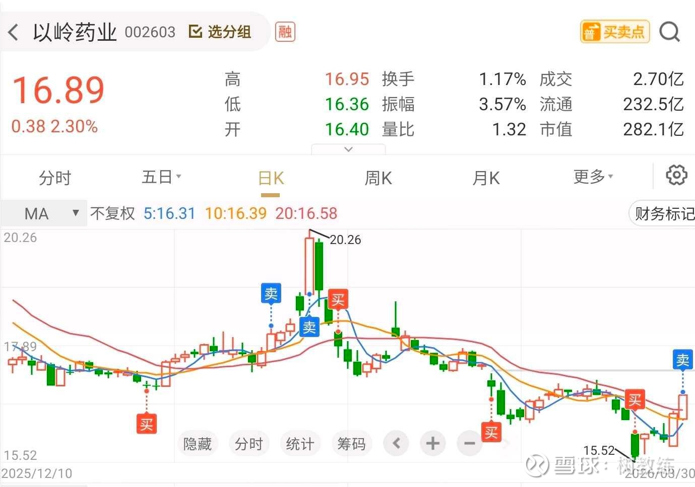 下午编完一道题的时候猛然想起股票,发现时间已是14:52,快收市了,此时以岭药业是16.88元。盘中以岭药业最高价是16.95元,没有成功卖出。于是把撤单把卖出价改为16.89元,一分钟左右就卖出了。这批是前段时间15.9元买进的。
