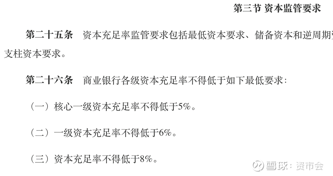 根据《商业银行资本管理办法》(2024年1月1日起实施)的监管硬指标,核心一级资本充足率不得低于5%,一级资本充足率不得低于6%,资本充足率不得低于8%。在实际操作中,监管部门对银行有更高的要求。