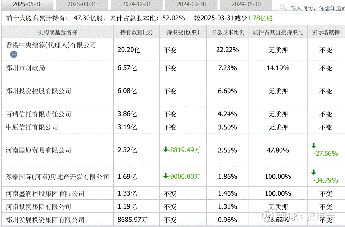 河南国原贸易有限公司上半年减持8819.49万股郑州银行,持股数量减少27.56%;股东豫泰国际(河南)房地产开发有限公司减持了9000万股,持股数量减少了34.79%。两者目前持股占总股数的2.55%和1.86%,分列第六、第七大股东。