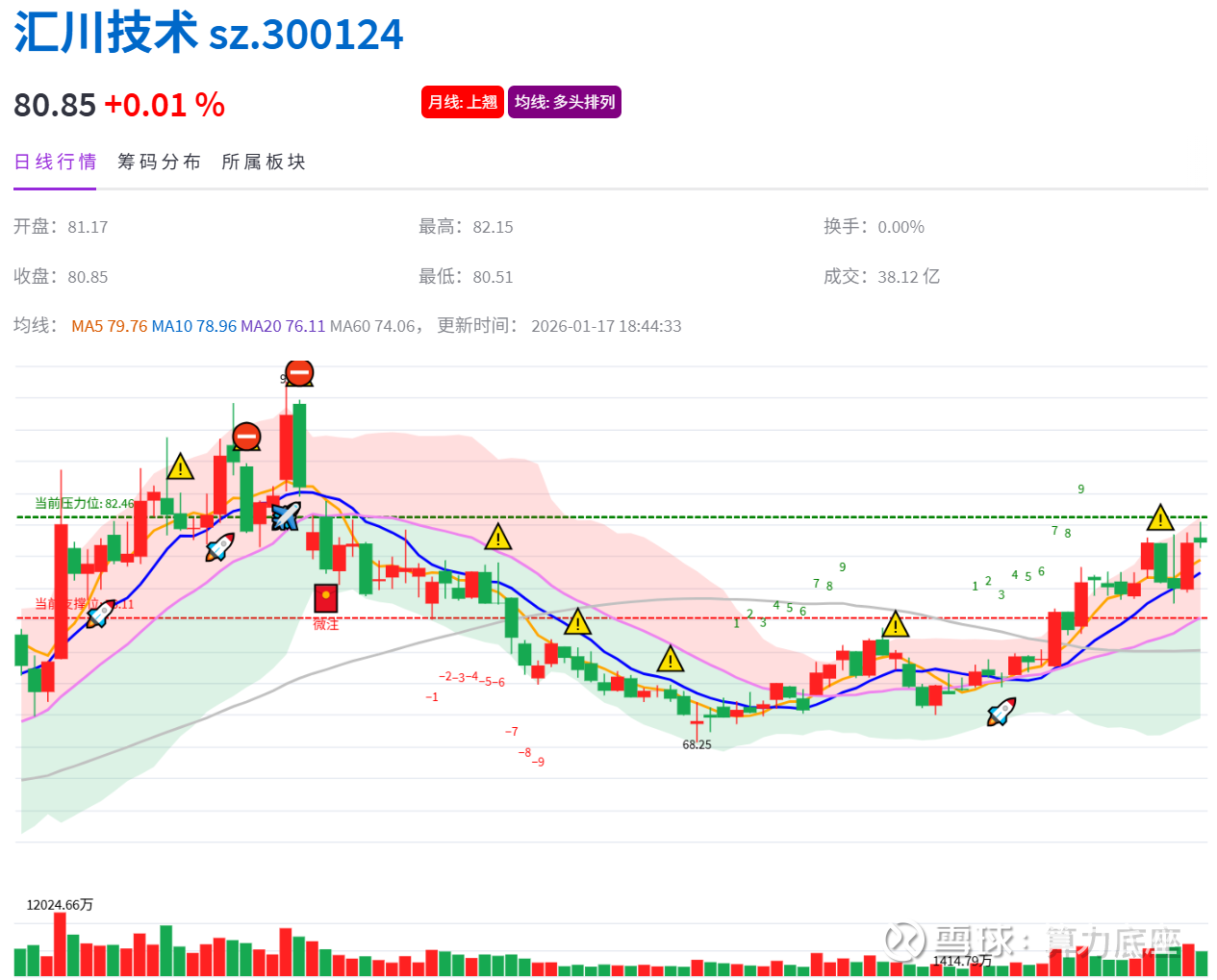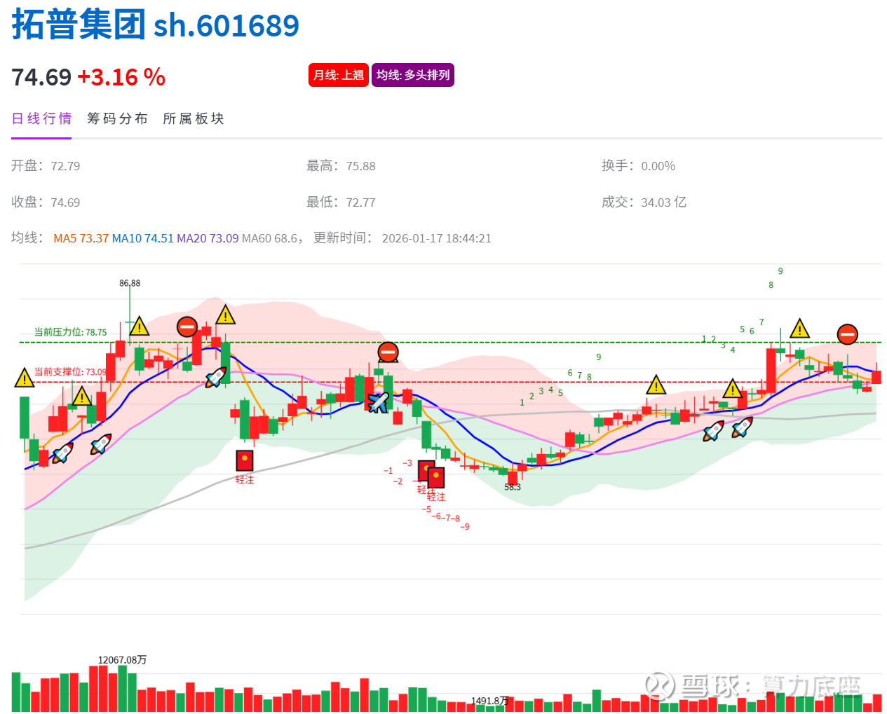 AI数据方面,拓普集团的趋势指标不错,2025年10月14日和11月10日两次发出捡漏的红包信号,近期于1月6日发出短期风险预警信号,随后个股逐步小幅度回调了一周多,目前处于正常上涨后的回调企稳的盘整阶段,目前支撑位73.09,压力位78.75。下周我们持续跟踪,看看能否迎来上攻突破箱体的机会点出现。$拓普集团(SH601689)$