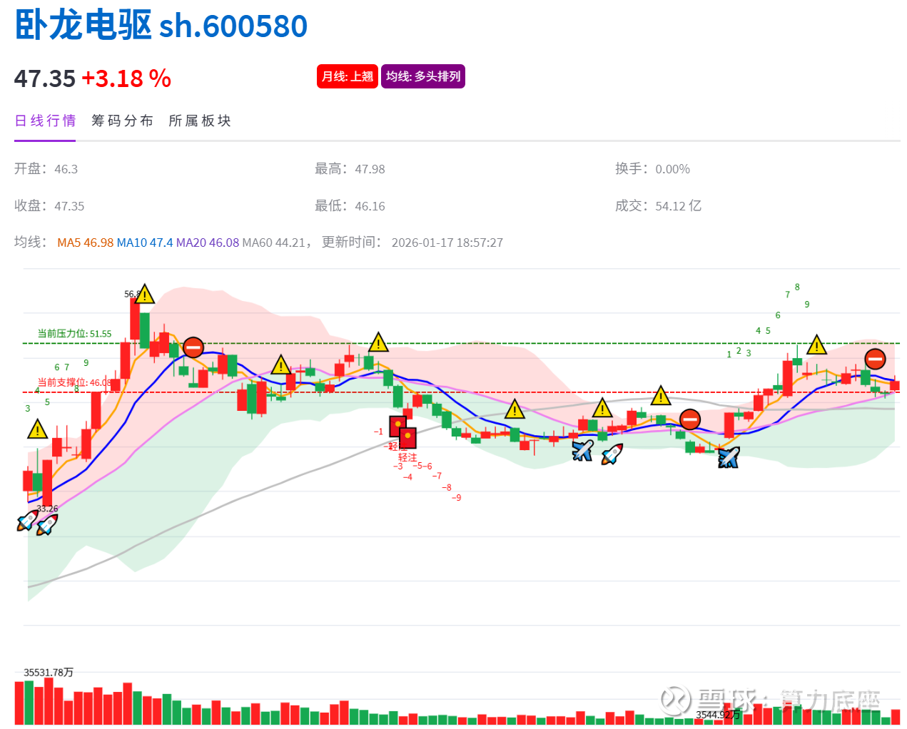 AI数据方面,卧龙电驱和拓普集团的走势很相似,同样是在1月6日有一个短风险预警的信号,也是回调了一周多。目前股价来到支撑位置46.08附近,下周急需一个小火箭才能重回强势。只能说加油了!下周我们重点关注下。$卧龙电驱(SH600580)$