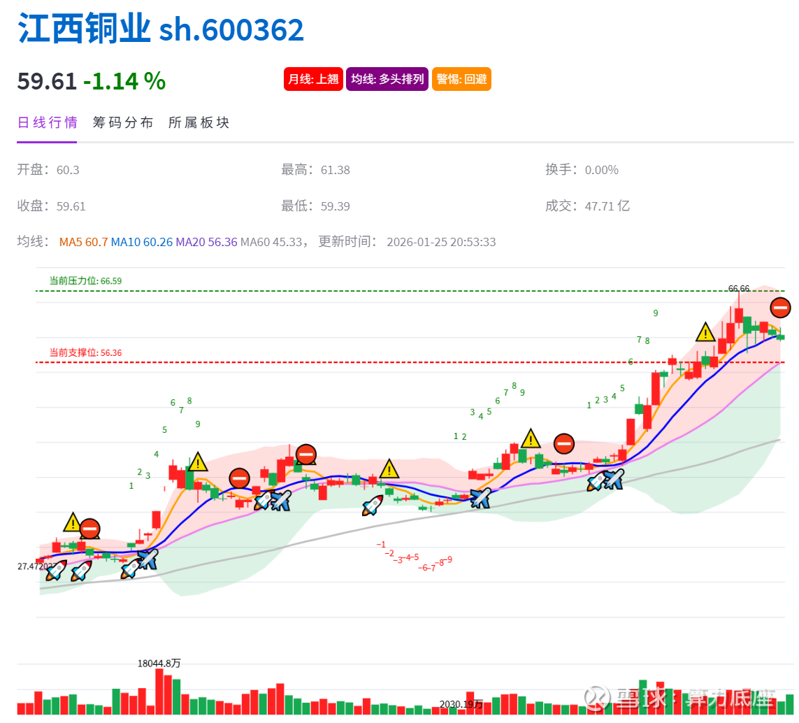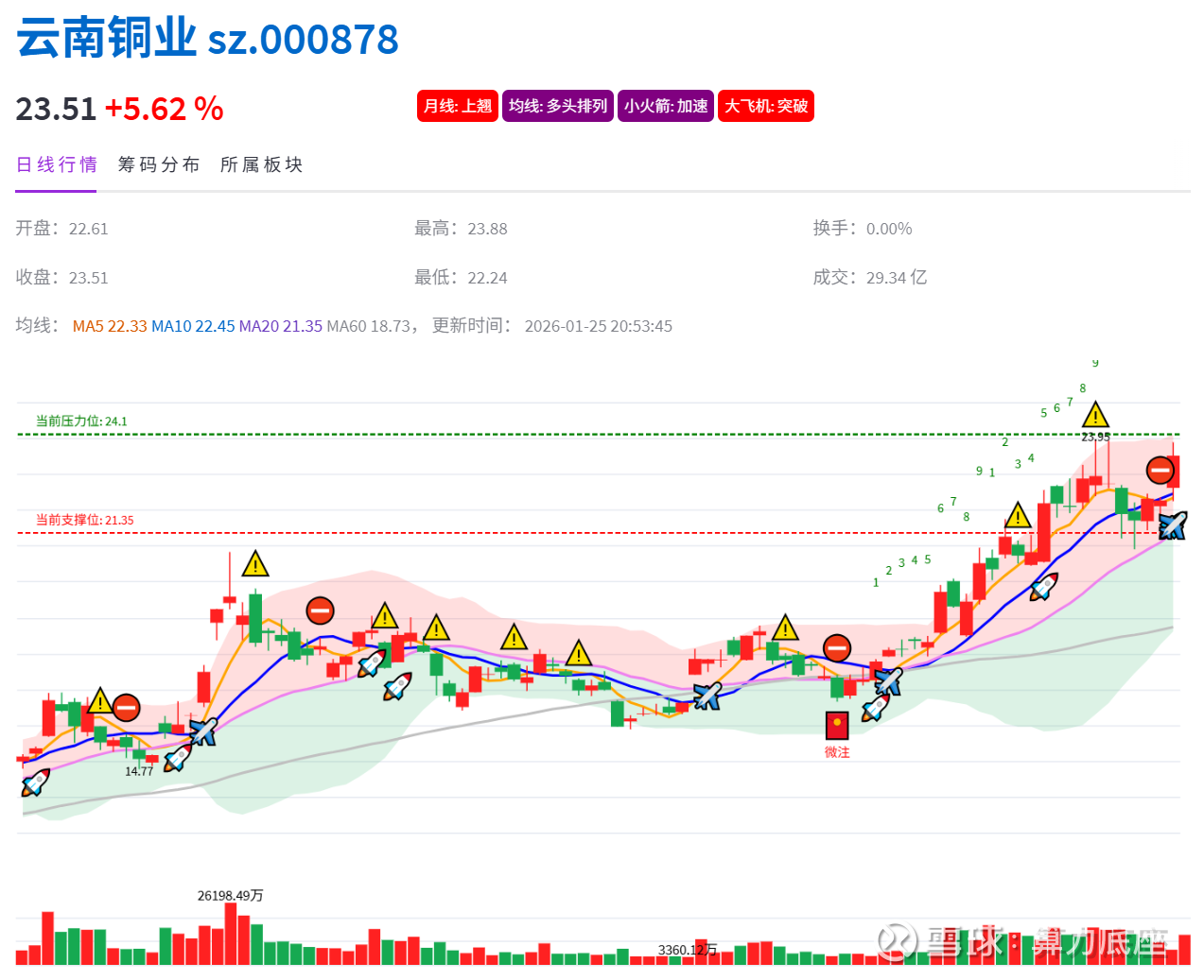 云南铜业,AI的数据还是惊人的拟合,于1月15日走到了玄学9同时AI也给出了短期风险预警的信号,随后股价经历了一周多的回调,并于1月23日周五效仿北方铜业,同时发出了短线加速小火箭和突破的大飞机信号。股价来到了压力位24.1的附近,看下周的了,能不能一鼓作气把这个压力位给突破掉。$云南铜业(SZ000878)$