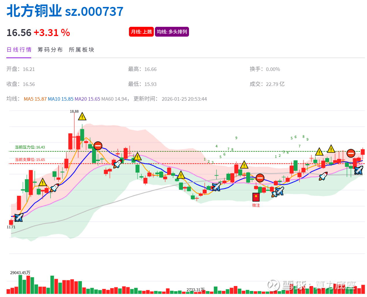 北方铜业,AI于1月22日周四同时发出短线加速小火箭和突破的大飞机信号。随后周五继续发力上攻,一举突破16.43的压力位。北方铜业的趋势指标不错,下周大概率延续涨势,阻力应该不会太大,看看能不能一句突破前期的高位。$北方铜业(SZ000737)$