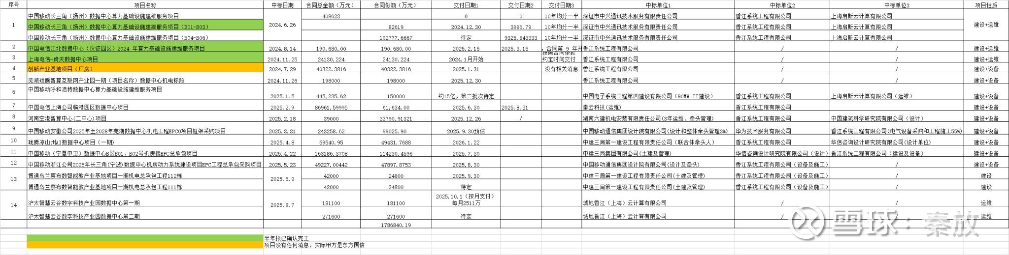 $城地香江(SH603887)$ 这两天抽空整理了下香江的订单情况,由此表可以看出,主要客户是:中国电信、中国移动、互联网X公司、东方国信和一些地方国企背景公司,根据半年报披露去年一些项目已经完工或者进入运维阶段,今年一些项目处于在建状态(截止到上半年)。中标日期多集中在去年六月到今年8月,这几个月没有新订单很可能是因为在手订单太多,资金和人员压力过大造成。合作伙伴都是些央企和大厂公司(间接体现了香江的身段)。