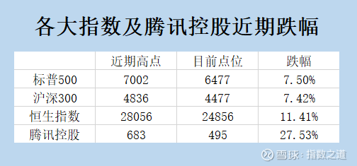 近期,各大指数持续调整,其中标普500、沪深300、恒生指数以及腾讯控股从近期高点到2026年3月26日收盘,跌幅详见下表: