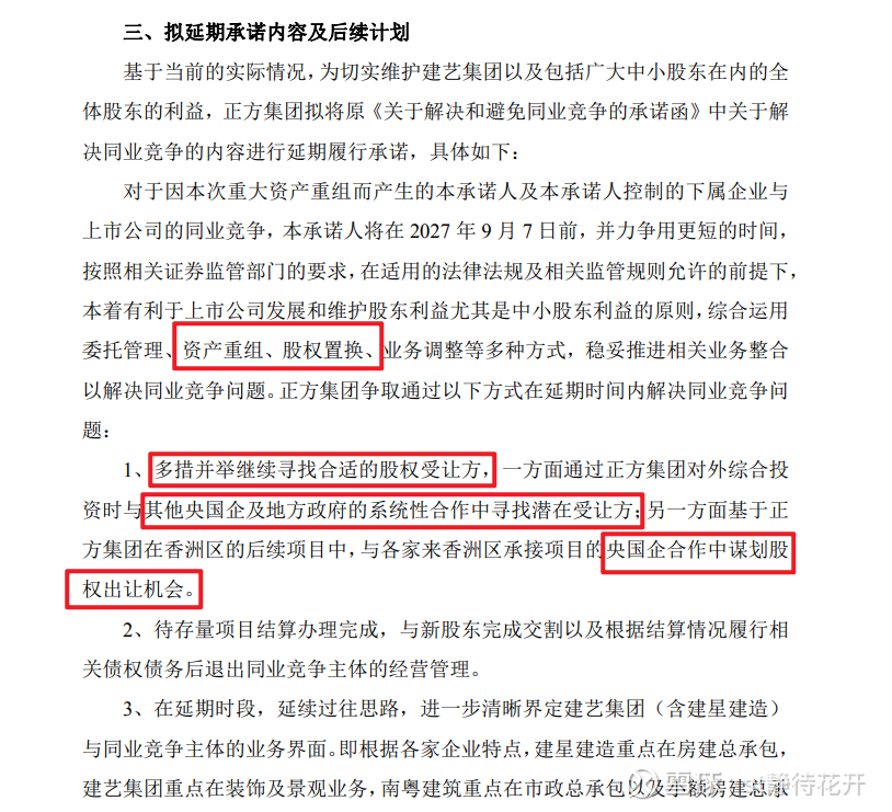 再看看9月份控股股东延期履行避免同业竞争承诺的公告,再一次印证了建艺不可能退市。毕竟如果建艺退市,这个同业竞争承诺延期,也就没任何意义了!