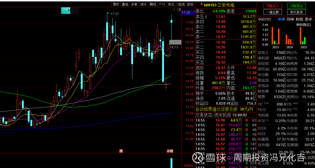 不久前,三安光电披露2025年第三季度报告及2025年度业绩预告,公司前三季度实现营业收入172.90亿元,同比增长14.3%;归母净利润8860万元,实现小幅盈利,但全年业绩预计净亏损2亿元至4亿元,扣非后净亏损7.5亿元至8.5亿元,成为2008年借壳上市以来首次年度亏损;叠加行业竞争加剧、第三代半导体量产爬坡不及预期影响,公司股价呈现震荡下行态势,截至2026年3月5日收盘价14.66元,总市值731.39亿元,较2021年高位缩水1300亿元,四年半跌幅近70%;但与此同时,公司碳化硅芯片实现量产供货,800