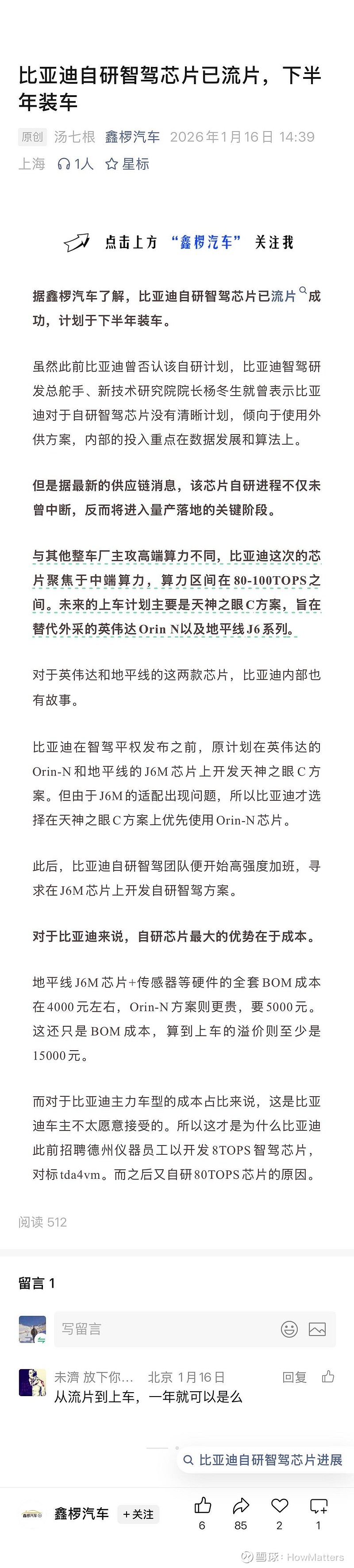 $地平线机器人-W(09660)$ 比亚迪自研芯片的信息是不是真的,希望可以求证。因为影响巨大,25年应该占J6E/M销量的大部分吧,第一大客户嘛。26年也是百万级出货。如果是真的,那华为/TESLA占了一块;蔚小理自研占了一块;合资部分momenta阵营的又占优,但不用地平线芯片;本来自主厂是大头,最大的比亚迪如果没了或少了,那影响巨大,另一个大头是吉利,不知道有没自研。这块饼就越来越小了。后续需要很辛苦的证明第三方优于自研,才能再拿回来。