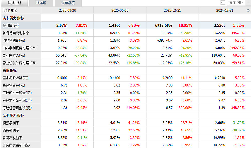 核心财务数据2025年前三季度,公司实现营业总收入约66.04亿元,同比下降约27.84%。