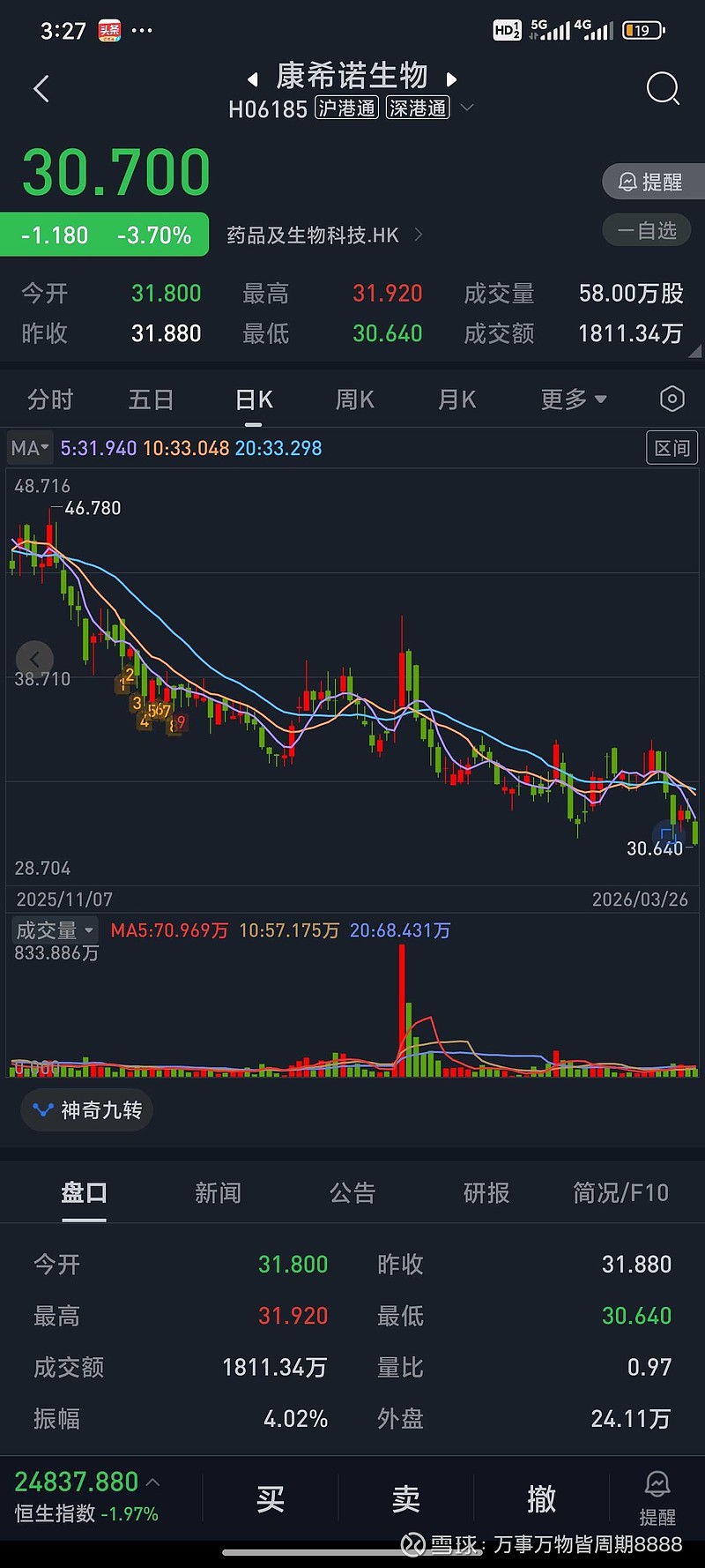 $康希诺(SH688185)$优先大盘新低,优先板块新优,优先同行新低今天新低抵抗力弱,说明昨天的跌是真跌,是真卖不要抱太多的幻想,事实胜于雄辩,持有不以年为单位,想赚钱不可能。也许要持有5年,8年,才能给错误的买入时间点进行纠偏。守股就象守寡,不要天天意淫。自唱自雷,没用!!