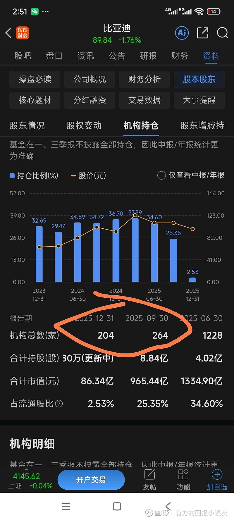 $比亚迪(SZ002594)$ 这些狗机构都是报喜不报忧,研报都是各种买入(什么出海全产业链等,讲烂了),看一下持仓从去年5月份见顶之后,主动性公募私募几乎集体清仓了比亚迪,从1228家到200多家(剩下的200多家基本都是被动ETF或者行业基金),所以看看风险多大,而且继续狗机构也不会和你讲风险,藏着掖着,遇到这种利润下滑竞争加大还是疯狂吹买入等散户接盘,偷偷出货走了,所以散户你去分析基本面还分析个🔨子,还等什么后面黑科技?现实吗?有黑科技现在就启动了