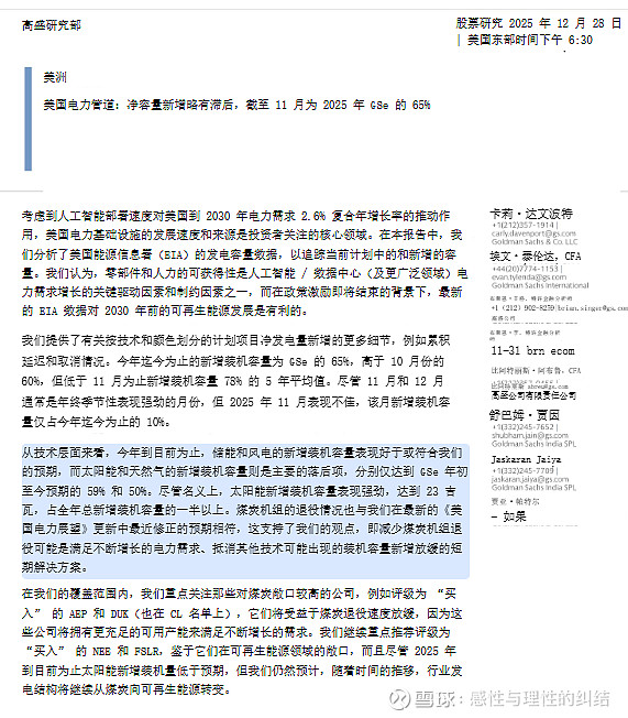 高盛于 2025 年 12 月 28 日发布的美国电力行业装机管道报告显示,截至 2025 年 11 月,美国电力净新增装机容量达41GW,仅完成 2025 年预测值(GSe)的65% ,低于78% 的五年同期平均水平;其中太阳能(59%) 和天然气(50%,含 CCGT) 是主要滞后领域,而储能(106%) 和风电(76%) 表现较好,同时煤炭退役量(4GW)符合下调后的预期,或成短期应对电力需求增长的方案;长期看,2030 年前行业需新增超 50 万名工人以缓解劳动力短缺约束,且高盛对 NEE、FSLR、AEP、DUK 等公司给予 “买入” 评级,看好其在可再生能源或煤炭领域的布局。