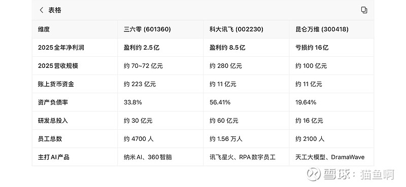 从具体数据来看(未出年报以三季报为准):科大公司人数1.56万、研发投入60亿、负债率56%、账面资金11亿,三季报营收169亿,年报预盈8.5亿算超预期。三六零员工4700人、研发30亿、负债率:22.64%、账面资金223亿、营收69亿、年报预盈2.5亿(扣非扭亏)超预期。昆仑万维人数2100、研发16亿、负债率19.64%、账面资金11亿、营收58亿、年报预亏16亿。