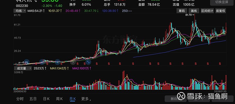 股价位置(参考下图):月线来看科大讯飞是一个完美的趋势稳步奔着新高,正宗的ai中军。三六零恰恰相反从60多到现在的12块,月线底部近几年异常放量但股价没动。昆仑万维则是爆发型选手,本月刚创出历史新高。