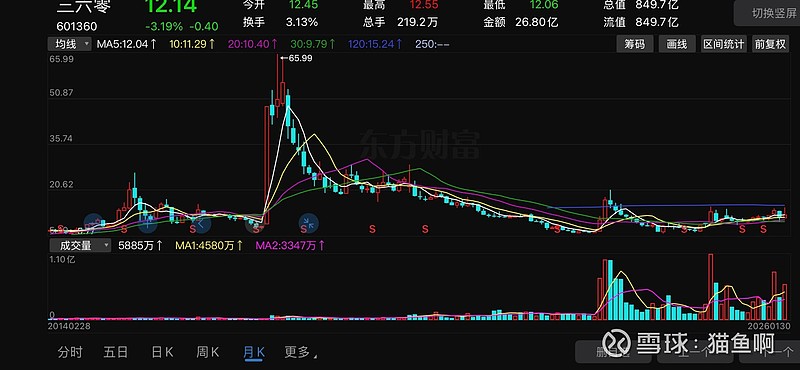 三六零的故事太复杂了,2016、17年从美股回归大a时候是巅峰期高富帅,想当年能和阿里腾讯硬钢的百度都是弟弟,峰值营收122亿利润33亿,回村之后次年开始家道中落,当时正是pc电脑的高峰走向衰落的时间点,靠着电脑杀毒软件和浏览器业务的广告收入风光了几年市值一度突破5000亿,后来智能手机兴起后玩电脑的人少了收入和利润连续回落,期间又有过几次失败的投资哪吒汽车的事计提了几年利润导致连续三年巨亏。当然回归a股之前不排除粉饰业绩了,但是这几年从5000亿到最低时的400亿市值也算是符合公司的价值走势,因为口碑这一块一直不好(离婚减持,投资失利、流氓软件)今年又赶上玉红事件让机构先走为敬。