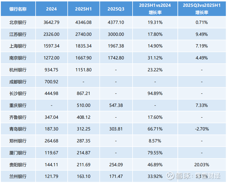 进入2025年第三季度,头部银行增速趋于平缓。北京银行增幅不到1个百分点、江苏银行、上海银行、南京银行等回落至个位数,分别为9.49%、7.19%和4.49%。青岛银行甚至出现-2.70%负增长。