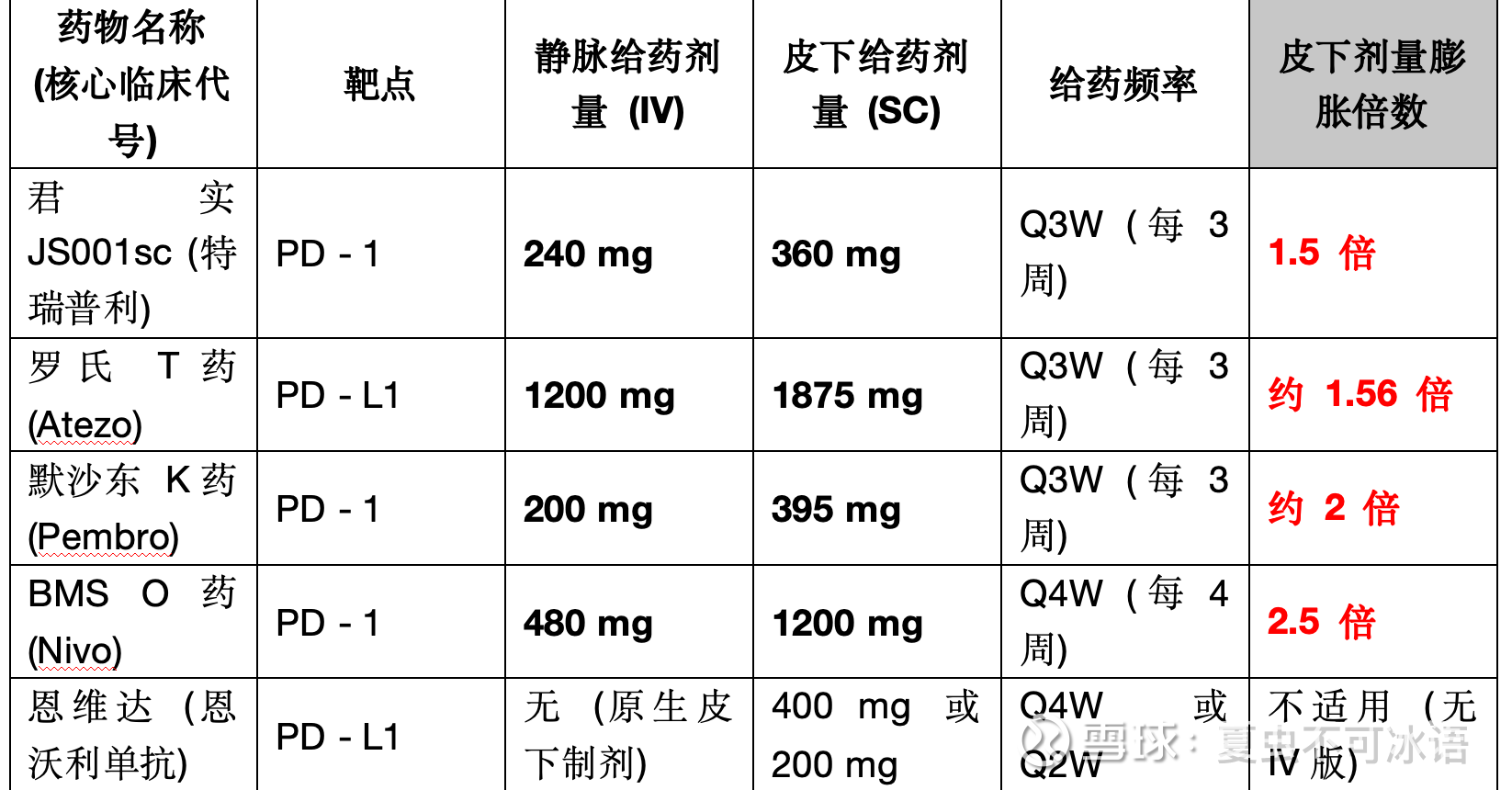 为了更充分的说明,我专门做了一个表格,大家先对比一下已经上市的这几款我认为比较有说服力的单抗皮下制剂药物,有PD1和PDL1。先看一下做三期试验时SCvsIV的剂量问题,我认为不看电池的大小光比较续航实在是耍流氓。。。