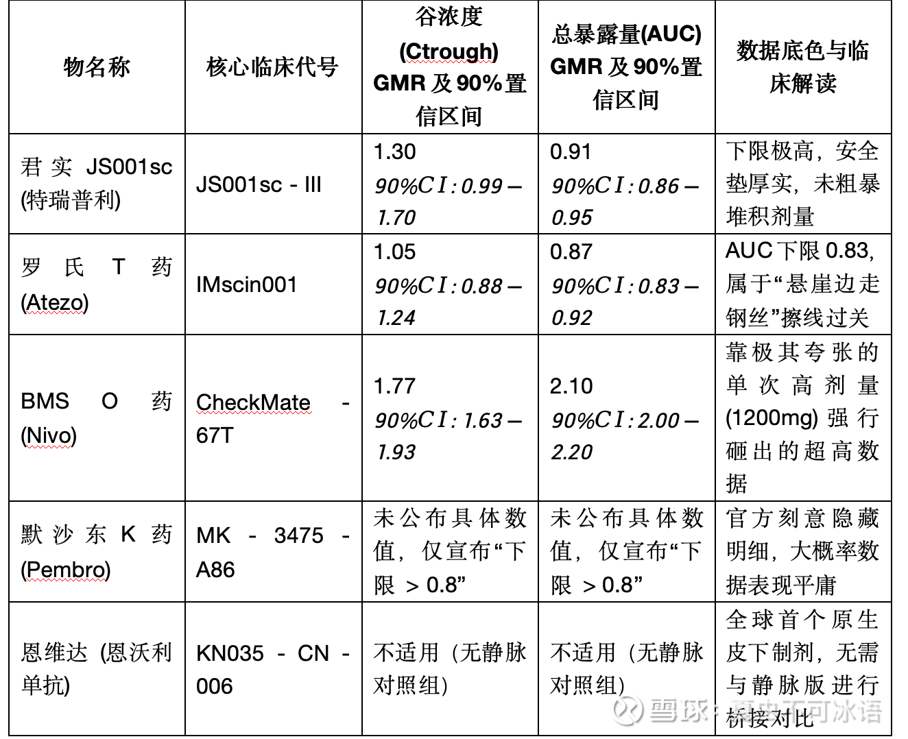 默沙东 K药(Pembro)虽然向 FDA 递交了上市申请,但在之前的学术大会上,只用了一句Ctrough 和 AUC 的 90%CI 下限均 >0.8,达成非劣效来概括,至今没有对外公布具体的点估计值和括号里的精确范围。 遮遮掩掩往往意味着数据没有达到“碾压级”的惊艳,大概率也是靠着增加一倍的剂量(395mg)擦着 0.8 的安全线飞过去的。要不然来中国CDE,现在还让提交补充申请了…美国那边上市咱管不了,中国这边我感觉冲这一条,CDE还是非常负责任的,绝对不是故意刁难默沙东。